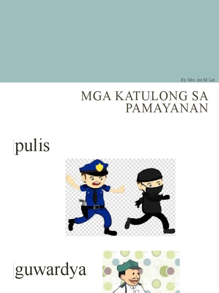 In the PDF file Mga Katulong sa Pamayanan there are 12 community helpers four on each page. Ang pamayanang ito ang nagbibigay sa atin ng isda at iba pang mga pagkaing dagat. Itoy maipakikita natin sa pagtulong sa kanila sa oras ng pangangailangan.